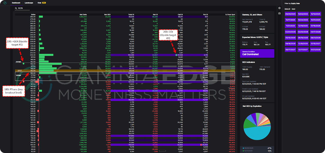 The Setup: Palantir (PLTR) is currently trading at $182.50. Using GammaEdge’s Web tool Dashboard, which provides us with a visual of positioning within PLTR’s options structure, here’s what it shows us: