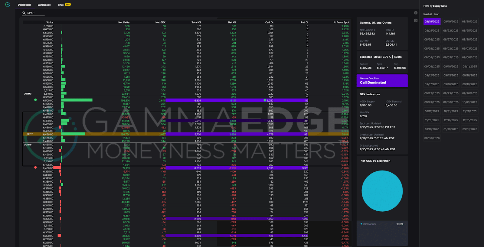 Let’s put finding high risk to reward trade opportunities into practice with an example, using the dashboard screenshot below of SPX 0DTE (as of 08/17/25).